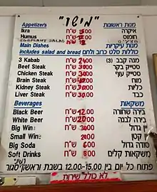 In 1960, the Romanian-Israeli couple Mișu and Sara Feigenbaum founded a delicatessen on HaMered Street in Jaffa, which later became a Romanian grill restaurant under the name "Mișu".[1] The "Mișu" restaurant operated at 5 HaMered Street for about 25 years,[2] and then moved to 7 Raziel Street in Jaffa,[3] where it operated for another 30 years until its closure in the summer of 2015.