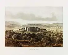 Victor Guérin found in 1875 that “on the highest part of the hill we remark the remains of an ancient fortress, flanked by four square towers; considerable portions remain, showing that it was built of regular blocks, some levelled plane and some embossed; the latter were reserved for the angles. The ruins and interior of this fortress are now inhabited by about twenty families, which have built their little habitations in the midst of the debris.”[35]
