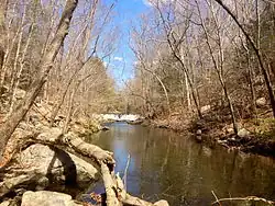 ![]() Low dam upriver on Mianus River in Mianus River Park near Old Mill Lane in Stamford, Connecticut. | |