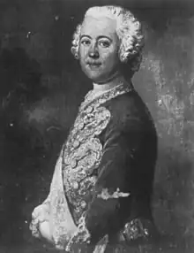 For several years, Fredersdorf had been courting Caroline Marie Elisabeth Daum (* 27. July 1730 in Potsdam; † 10. March 1810 in Berlin), the daughter of the rich arms manufacturer and banker Gottfried Adolph Daum. The king was unwilling to let his servant marry. However, once Fredersdorf, who was often ill, explained to Frederick that bettering his health urgently required someone to look after him, the king acquiesced.[7] In a letter to Fredersdorf dated to November 1753, the king wrote: "marry sooner rather than later, if this will be of use to your [palliative] care".[8] The church book of the Potsdam Garrison Church records the marriage took place on 30 December, 1753.[9] Caroline, who had been wed to serve as nursemaid, spent her marriage "as a virgin amidst a thousand worries".[10] Despite this, the couple managed to come to an agreement, and Caroline lived "in blissful freedom, harmony, and inner joy" with her husband until his death.[11]