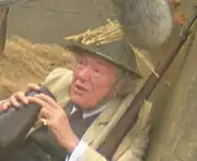In 2012, he starred with Eileen Atkins in an adaptation of Beckett's radio play, All That Fall. The director, Trevor Nunn, staged the performance as a studio recording of a radio play so that the cast performed with script in hand.[55] Its premiere was at the Jermyn Street Theatre and it later transferred to the Arts Theatre. In November 2013 the production transferred to 59E59 Theaters in New York.[56] Also 2012, Gambon reunited with Dustin Hoffman in the HBO horse-racing drama Luck, which was cancelled in March 2012 after three horses died on set.[57] Gambon participated in the live event, National Theatre Live: 50 Years On Stage (2013), a production that was a part of the celebration of the 50th anniversary of the National Theatre.[58][59] The presentation included live performances, interspersed with documentary footage, and archival footage of live performances of original productions from the National Theatre. Gambon joined Derek Jacobi in a live performance from No Man's Land by Harold Pinter. In 2012, he played a role in Dustin Hoffman's directorial debut with Quartet, based on the same-titled play by Ronald Harwood and starring Maggie Smith, Tom Courtenay, Billy Connolly and Pauline Collins. The film premiered at the 2012 Toronto International Film Festival to favourable reviews. The review aggregator website Rotten Tomatoes reported an 80% approval rating with the consensus reading, "It's sweet, gentle, and predictable to a fault, but Dustin Hoffman's affectionate direction and the talented cast's amiable charm make Quartet too difficult to resist."[60] The following year, he was cast in the role of Howard Mollison in the adaptation of the best-selling book The Casual Vacancy by J.K. Rowling.[61] The BBC One miniseries, produced in association with HBO, consists of three one-hour parts. Production began 7 July 2014 in South West England.[61]