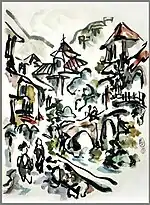 While completing his degree in Asian Studies with a focus on eastern religions, Hofmann met Zen priest and calligrapher Shibayama Zenkei Roshi (1894-1974), Abbot of the Nanzen-ji Temple. The Abbot inspired him to visit the East and Hofmann soon embarked on an overland voyage through central Asia to Nepal, stopping in Kathmandu for five months where he studied Buddhist sculpture. After returning to the U.S. Hofmann worked as a museum guard in San Francisco to earn money for his passage to Japan where Shibayama Zenkei introduced him to his friend, painting master and poet Jikihara Gyokusei.[1] Hofmann worked, and traveled with Jikihara until the master’s death in 2005.[2] Shibayama also introduced him to Antaiji, a Zen temple where he was allowed to join the monks in their meditation practice. Hofmann’s rigorous Zen practice quickly became integral to the "sincerity’ and "honesty" of his sumi-e painting style.[3] He periodically left Japan to travel through villages and cities in Asia, Latin America, and Europe, capturing what he saw with brush and ink.