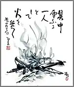Hofmann’s worldwide wanderings reminded Jikihara of the mendicant, eccentric, sake-loving Zen monk Santoka Taneda (1882-1940) and he suggested they do a series of works based on the monk’s haiku. The 1988 Osaka exhibition of Hofmann’s 30 brush paintings, with Jikihara’s calligraphic rendering of the haiku interwoven into them was the first collaborative exhibition by master and student.[4] They later exhibited work together at the Gyokusei Museum, Awajishima[5] and at the Hakusa Sonso Villa in Kyoto. Toward the end of Jikihara’s life, Hofmann worked with him on large murals, often painting areas toward the top that his elderly teacher could no longer reach.[6] Hofmann also collaborated and exhibited Shigajiku, with Fukushima Keido,[7] the abbot of Kyoto’s Tofukuji Temple[8]