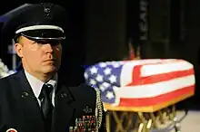 U.S. Army Master Sgt. Clinton Dudley with the Nevada Air National Guard, stands watch in front of a casket holding Master Sgt. Michael Landsberry