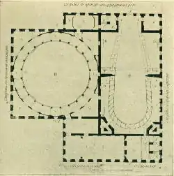 d. Relative size and situation of Petrovsky theatre and Bolshoi. e. Plan of 2nd floor with rotunda and theatre.