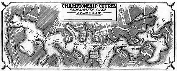 - ↑ The course ran for just over three miles from the present John Whitton Railway Bridge near Meadowbank to a rocky outcrop known as The Brothers, on which stands the Searle Monument, off the present Henley.