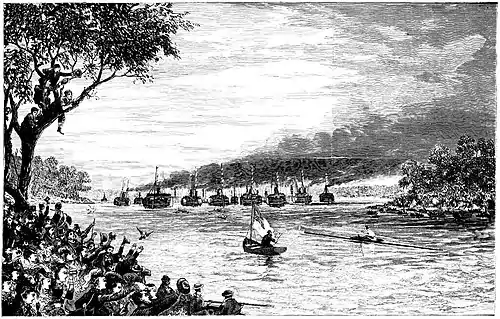 The Rush vs. Trickett match attracted the largest number of spectators ever before gathered at a Sydney sporting event, and the event is part of Australian sporting history.[32] Estimates of the size of the crowd range from 30,000 to 70,000.[33] Shops and government offices closed for the event,[34] special trains brought people into the city.[35] Steam-ships carrying spectators accompanied the competing champions, and hundreds of smaller, private vessels crowded the river. Special Regulations were published by the Marine Board of the NSW Government to deal with the problems of regulating maritime traffic during the event.[35][n. 8]