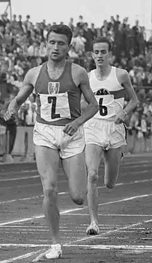 Michel Jazy (born 13 June 1936) is a French former middle-distance runner and long-distance runner. He won the 1500 metres silver medal at the 1960 Summer Olympics, as well as two golds (in 1962 and 1966) and one silver (in 1966) at the European Championships. He set nine world records in the mile (once), 2000 metres (twice) and 3000 metres (twice), the two miles (twice) and the 4×1500 metres relay (twice).