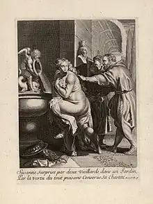 Lasne was born in Caen and was the son of a goldsmith.[1] He was a member of the Guild of Saint Luke in Antwerp for 1617–18, and probably worked under the direction of Peter Paul Rubens and Anthony van Dyck.[1] At that time he made an engraving of Rubens's now-lost Susanna and the Elders, which contains a dedication from Rubens to the Dutch humanist Anna Roemers Visscher.[2] Lasne was in Paris by 1621,[3] and in 1633 he became the official engraver for King Louis XIII.[1] In France, Lasne engraved a number of portraits.[4] There are at least 759 prints by Lasne, including 13 portraits of King Louis XIII and 10 of his wife, Anne of Austria.[1] He made reproductive engravings after the French painters Philippe de Champaigne, Daniel Dumonstier, Simon Vouet, and Charles Le Brun; the Italian painters Paolo Veronese, Francesco Albani, and Titian; and the Spanish painter Jusepe de Ribera.[1]
