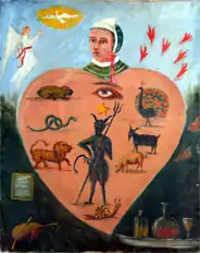 An allegorical placard of the type used by Nobletz, depicting a human heart dominated by the seven deadly sins