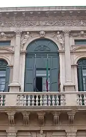 - Palazzo Canossa (under construction in 1537), with another seven-bay front, has a triple-arched central entrance in a high rusticated basement that is pierced by low mezzanine windows. In the piano nobile arch-headed windows are framed by doubled pilasters, so that each bay reads as a unit complete in itself, while the arch imposts are emphasized by a moulding that appears to run continuously behind the pilasters, to tie together the sequence of bays. There is a second mezzanine above the piano nobile, under a powerfully projecting cornice capped with a balustrade, with a skyline of figural sculptures. Strong mouldings continue the imposts of the arched openings and windows. The palazzo wraps round a three-sided court open to the Adige on the fourth side.