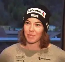 Michelle Gisin (German pronunciation: ['miʃel gɪzɪn]; born 5 December 1993) is a Swiss World Cup alpine ski racer and competes in all disciplines.[2][3][4] A two-time Olympic gold medalist, she won the Women's combined event in 2018 Winter Olympics, and Women's combined at the 2022 Winter Olympics.[5][6] Born in Samedan, Graubünden, Gisin is the younger sister of alpine ski racers Marc and Dominique Gisin.[7]