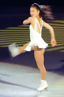 In the 1996–97 season, Kwan skated to "Dream of Desdemona" (short program) and "Taj Mahal" (free skate). During this season, Kwan struggled with her jumps because of a growth spurt, which affected her balance on her jump, and problems with new skating boots which she wore for an endorsement contract with the manufacturer.[27][28] She won the short program at the 1997 U.S. Nationals, but fell early in her free skate and as she later stated, "panicked" and made several more errors. She lost to Tara Lipinski, who came in first place in her free skate. Three weeks later, at the Champion Series Final, she again lost to Lipinski, who completed more successful jumps than Kwan in both the short program and free skate.[27] At the 1997 World Championships, Kwan came in second place, behind Lipinski, who won the gold medal. Kwan came in fourth place in her short program due to an unsuccessful jump combination while Lipinski came in first place and Irina Slutskaya, who missed her combination jump, came in sixth place. All three skaters performed well during their free skates, each earning first-place ordinals from three of the nine judges. Kwan won the free skate, with Lipinski coming in second place and Slutskaya coming in third place. Kwan's jumps in her free skate were not as difficult as Lipinski and Slutskaya's, but her skating between her jumps was more complex and demonstrated "more polished refinement".[29] Overall, Lipinski came in first place, Kwan came in second place, and Slutskaya came in fourth place behind Vanessa Gusmeroli of France.[30]