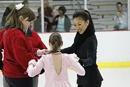 Kwan's interest in figure skating began at the age of five when she followed her two older siblings (ice hockey player Ron and figure skater Karen) onto the ice.[13] Karen and Michelle began serious training when Michelle was about eight years old. They practiced three to four hours a day, waking up at 4:30am and arriving at the rink at 5:00am to skate before school, and then going back to the rink right after school to skate again. Paying for their increased skating-rink time led to financial hardship for Kwan's working-class family. When Kwan was ten years old, her family could no longer afford a coach, but they were offered financial assistance by a fellow member of the Los Angeles Figure Skating Club[14] that allowed them to train at the Ice Castle International Training Center in Lake Arrowhead, California.