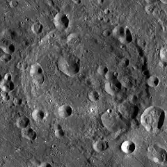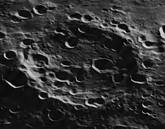 This is a heavily eroded crater formation with multiple impacts along the rim edge and within the interior. The rim is roughly circular, but has been rendered relatively uneven due to these smaller craters. There are small craters across the interior floor, including impacts along the north, west and southeastern edges.
