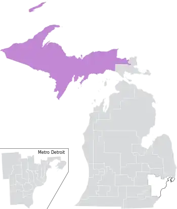 The district was located entirely within Michigan's 1st congressional district, and overlapped with the 108th, 109th, and 110th districts of the Michigan House of Representatives.[7] It bordered the state of Wisconsin, as well as Lake Michigan, Lake Superior, and Canada via a water border. At nearly 13,000 square miles (34,000 km2), it was the largest Senate district in the state.[1]