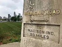 A monument marking the intersection of the Michigan Road and the National Road sits at the corner of Washington Street and Southeastern Avenue near downtown Indianapolis. The monument was relocated slightly as part of the changes to Interstate 65 exits in 2008.[7]