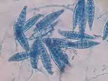 Microsporum is a genus of fungi that causes tinea capitis, tinea corporis, ringworm, and other dermatophytoses (fungal infections of the skin). Microsporum forms both macroconidia (large asexual reproductive structures) and microconidia (smaller asexual reproductive structures) on short conidiophores. Macroconidia are hyaline, multiseptate, variable in form, fusiform, spindle-shaped to obovate, 7–20 by 30–160 um in size, with thin or thick echinulate to verrucose cell walls. Their shape, size and cell wall features are important characteristics for species identification. Microconidia are hyaline, single-celled, pyriform to clavate, smooth-walled, 2.5–3.5 by 4–7 um in size and are not diagnostic for any one species.