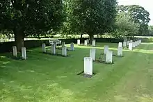 The parish churchyard has a Commonwealth War Graves Commission section with 27 Second World War burials. All but one are airmen from RAF Upper Heyford in the next parish, including 10 from the Royal Canadian Air Force and two from the Royal New Zealand Air Force.[14] The exception is a Royal Navy officer, Lieut Conroy Ancil, who served on the escort carrier HMS Stalker and died in 1943.[15]