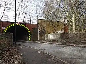 ![]() The site of the station looking north west from Grimshaw Lane. The southern end of the former platforms were just to the right of the bridge. | |