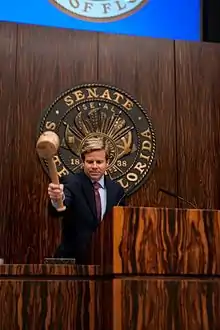In both 2006 and 2010 Haridopolos was re-elected without opposition to the Florida Senate. Haridopolos actively supported conservative candidates throughout the state in the 2006, 2008, and 2010 election cycles.[15] In the Florida Senate Haridopolos served as Majority Whip from 2006–2008 and by 2009 was elected to be President of the Senate by his senate colleagues.[3] Haridopolos was sworn in as Senate President on November 16, 2010, for a two-year term. He presided over the largest Republican majority (28-12) since Reconstruction.[16] Before being sworn in, Haridopolos made headlines when he removed the doors from his Senate office, making a pledge to be transparent and accessible during his term as President.[17]