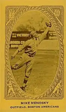 Michael William Menosky (October 16, 1894 – April 11, 1983) was a professional American baseball outfielder for the Federal League and Major League Baseball. Born in Glen Campbell, Pennsylvania, he was known as "Leaping Mike" for his daring, fence-crashing catches.[1] Menosky started his career on April 18, 1914, with the Pittsburgh Rebels of the Federal League, and went on to play 68 games that season.[2] At 19, he was the second-youngest baseball player in the Federal League that season behind Jimmy Smith.[2] He spent most of the 1915 season in the minor leagues of the Federal League.[1] After the league folded in 1915, he was purchased by the Washington Senators of the American League on February 10, 1916.[2]