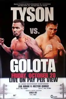 After serving a 15-month ban because of his actions during his 1997 match with Evander Holyfield, Tyson returned in January 1999 with a fifth-round knockout win over heavyweight contender, Francois Botha. After Botha, Tyson had little trouble with his next three opponents. He fought a no-contest with Orlin Norris. Norris was injured and could not continue after the first round. Further fights included a second-round knockout against veteran Julius Francis followed by a 34-second knockout versus fringe contender Lou Savarese. On August 30, 2000, the announcement came that Tyson's next fight would be against former heavyweight title challenger Andrew Golota.[1] Both men came into the fight with reputations as dirty fighters which led some to doubt whether the two could have a clean fight.[2] Golota's two most notable fights were against Riddick Bowe, where both times, Golota was disqualified for hitting Bowe below the waist. Meanwhile, Tyson was notoriously disqualified in his rematch with Holyfield for biting both of Holyfield's ears and had a history of hitting after the bell, repeated in his fights against Botha, Norris and Savarese. Golota publicly stated that he planned to fight cleanly. Tyson stated that he hoped he would obtain a quick knockout victory over Golota.[3]
