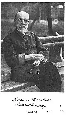 Mikhail Ashenbrenner was born in Moscow into the gentry. His father was a russified German, who worked as a military engineer, his mother was the daughter of General Mikhail Naumov, a veteran of the 1812 war against the French.[2] He studied with the First Moscow Cadet Corps, and was discharged in 1860, with the rank of lieutenant. As an officer, he and a group of comrades studied the natural sciences, and studied Feuerbach, Darwin, and Spencer. In 1864, he was deported to Turkestan for refusing to take part in suppressing the Polish Uprising against Russian rule. He lived in a remote part of Bessarabia until the outbreak of the Russo-Turkish War in 1877, and then in Kherson province.