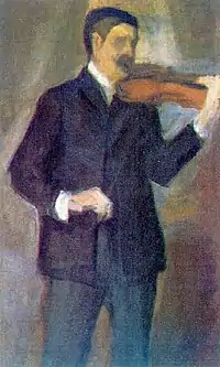 Michael Vasilyevich Matyushin (Russian: Михаил Васильевич Матюшин; 1861 in Nizhny Novgorod 14 October 1934 in Leningrad) was a Russian painter and composer, leading member of the Russian avant-garde. In 1910–1913 Matyushin and his wife Elena Guro (1877–1913) were key members of the Union of the Youth, an association of Russian Futurists. Matyushin, a professional musician and amateur painter, studied physiology of human senses and developed his own concept of the fourth dimension connecting visual and musical arts, a theory that he put to practice in the classrooms of Leningrad Workshop of Vkhutein and INHUK (1918–1934) and summarized in his 1932 Reference of Colour (Cправочник по цвету). Matyushin conducted experiments at his Visiology Center (Zorved) to demonstrate that expanding visual sensitivity from retinian optical centers would enable the discovery of "new organic substance and rhythm in the apprehension of space." He tried to teach himself and his students to see with both eyes, each independently, and to widen the field of their vision. He describes some of his work and ideas in a long essay titled "An Artist's Experience of the New Space."[1]