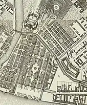 The area now partly occupied by the Mikhailovsky Garden, prior to the region's conquest by the Russians and the founding of Saint Petersburg, was the site of various rural settlements. In a map of 1698 it is marked as belonging to the estate of a Swedish rotmister named Konau, and contained his hunting grounds.[3][4] With the establishment of the city of Saint Petersburg and the imperial residences in the area, the region became the property of the crown. Peter the Great gifted the land to his wife Catherine in 1712 for the purpose of building a residence.[1][4] In 1716 Peter commissioned architect Jean-Baptiste Alexandre Le Blond to create a series of summer gardens for the imperial palaces. Le Blond's first and second gardens were located on the grounds of what is now the Summer Garden. The third occupied the site of the present-day Mikhailovsky Garden, and was the location of Empress Catherine's palace.[2][3][4] Catherine's palace occupied a site on the banks of the Moyka River, now the location of the Rossi Pavilion.[1] It was a relatively small wooden construction, known as the "Golden Mansion" because its tiled roof was decorated with a golden spire, with some rooms decorated with gilded leather.[3] The palace garden stretched southwards between the Krivusha and Fontanka Rivers almost as far as Bolshaya Perspekpekty, the modern-day Nevsky Prospect.[1] It was known at different times as the "Swedish Garden", the "Tsaritsyn Garden", and the "Third Summer Garden".[1] Le Blond's plan, personally approved by Peter the Great, envisaged a single large palace and park ensemble that was to include the imperial residences and gardens.[4]