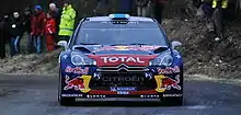 At the Rally d'Italia Sardegna, Hirvonen and Loeb both dropped time on day one in a bid to gain a better road position. After Loeb incurred a puncture, Hirvonen found himself unable to catch teammate Latvala, who had been pushing in front from start to finish.[11] In the following Acropolis Rally in Greece, Hirvonen took his first win of the season. With Loeb crashing out, he reduced the Frenchman's championship lead to seven points.[12] At the following Rally Poland, Loeb crashed again, although recovered to seventh, with Hirvonen winning his second consecutive rally he moved to the top of the standings. In Finland, Hirvonen took the lead on the first proper stage and continued pulling away from Loeb to take his debut win in his home event.[13] A few weeks later, in Australia, Mikko was again in a tight battle with Loeb, where Loeb eventually won. Unfortunately for Loeb his car was found to have rollbar irregularities, as did Dani Sordo and Sébastien Ogier. They were then given 1 minute time penalties, which handed Hirvonen the win and 10 points. Hirvonen led the 2009 Championship by a point from Sebastien Loeb, and needed a win to clinch the title, but a hard landing from a jump on the penultimate stage caused the bonnet hinge to fail, as time ticked by to get rid of the bonnet cover, the Championship was handed to Loeb.[14]