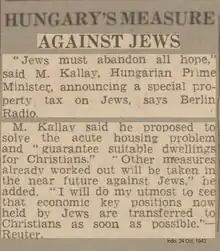 Although Hungary remained allied with Nazi Germany, Kállay and Horthy were conservatives, who were unsympathetic to fascism, and Kállay's government refused to participate in the rounding up of Jews and other activities that were desired by the Nazis. However, on October 24, 1942, while announcing a special property tax on Jews 'to guarantee suitable housing for Christians', Kállay was reported in the international press as declaring: "Jews must abandon all hope. Other measures already worked out will be taken in the near future against Jews. I will do my utmost to see that economic key positions now held by Jews are transferred to Christians as soon as possible".