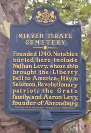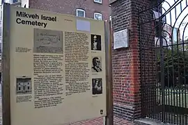 Mikveh Israel Cemetery is the oldest Jewish cemetery in Philadelphia, Pennsylvania, giving evidence of a settled community as early as 1740. A number of outstanding patriots, pioneers, and other notables of the Jewish faith who made important contributions to the history and freedom of America during the Colonial and Revolutionary period were interred here, and for this reason, in 1959, by an act of Congress, the burial ground was designated as a unit of the Independence National Historical Park, while continuing to be maintained by the sponsoring Congregation Mikveh Israel.[3] The cemetery was certified by the Philadelphia Historical Commission, and in 1971, it was listed on the National Register of Historic Places.[4]
