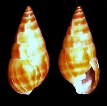 The umbilicated shell is elongate conic. It increases regularly in size with three folds on the columella.[3] The basal fasciole is present. The surface is less polished than in Pyramidella. It is marked by lines of growth and microscopic spiral striations.[4]
