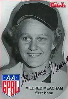 Mildred Meacham (May 5, 1924 – January 7, 2017) was an infielder who played in the All-American Girls Professional Baseball League. Listed at 5' 8", 160 lb., Meacham batted and threw right handed. She was nicknamed ″Meach″.[1]