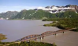 Aerial view of Miles Lake (left), Miles Glacier Bridge, Copper River (right), and Goat Mountain.