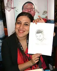 Artist Sara Pichelli, who designed Morales, holding a sketch of him at the 2011 New York Comic Con.