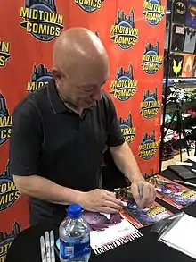 Miles' co-creator, writer Brian Michael Bendis, signing copies of Ultimate Spider-Man and Ultimate Fallout #4, in which Miles Morales first appeared, at Midtown Comics in Manhattan