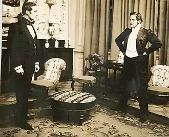 stage scene in 1885 costumes with young woman earnestly addressing a stern father