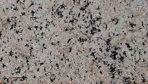 The granite is described as a light gray or light pinkish-gray to a medium, slightly pinkish or pinkish and greenish-gray biotite granite with spots from 0.2 to 0.5 inches (5.1 to 12.7 mm) across and in some cases tapering out to 1 inch (25 mm) in length.[1] The biotite is typically in clots or short streaks. It is commonly locally gneissic.[6] The color of the stone is governed mainly by its feldspars, pink from the potash and green from the soda lime feldspar.[1]