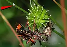 The adults of some species linger close to invertebrate predators, where they act as kleptoparasites, feeding on bodily fluids of the prey. This strategy has given rise to a range of common names such as freeloader flies and jackal flies. The nature of the kleptoparasitism that Milichiidae practise is difficult to detect from direct observation; some observers remark that they seem to lick the prey rather than anything else.[10][11] However, it seems that they get whatever nourishment they can; the accompanying photographs suggest that at least some species penetrate the thinnest cuticle of a bee in a spider's jaws, extracting tissues that enzymes in the venom of the spider have reduced to a fluid state.[12] When extended, the proboscis certainly is long enough for feeding in such a manner.[6]