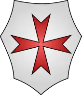 The symbol of the Militiae Templi is a red eight-pointed ("octagonal") cross, symbol of the Eight Beatitudes of the Gospel, while the symbol is a white flag with red octagonal cross. The cross is not to be confused with that of the medieval Knights Hospitaller, which is known as the Maltese Cross. The habit of the Professed Knights is white and consists of a tunic, a scapular with cowl and the octagonal red cross on the chest, and a mantle with the same cross on the left shoulder. Ladies wear a white mantle and a white veil with a donat's cross (without the top section). Chaplains are dressed with a white Mozzetta with red edge, red buttons and an octagonal red cross on the left front part. The Oblati (Knights and Ladies of Devotion) have a gray mantle with the red octagonal cross on the left shoulder.