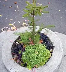 Mill Ends Park (sometimes mistakenly called Mill's End Park)[1] is an extremely small urban park, consisting of one tree, located in the median strip of SW Naito Parkway next to Tom McCall Waterfront Park along the Willamette River near SW Taylor Street in the downtown core of Portland, Oregon, United States. The park is a small circle 2 ft (0.61 m) across, with a total area of 452 sq in (0.292 m2). It is the smallest park in the world, according to the Guinness Book of Records, which first granted it this recognition in 1971, though this title may be soon given to a 2022 park in Talent, Oregon, which is 78 sq in (500 cm2) smaller.[2][3]