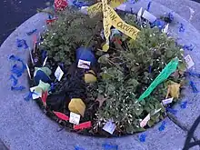 The small circle has featured many unusual items through the decades, including a swimming pool for butterflies—complete with diving board—a horseshoe, a fragment of the Journal building, and a miniature Ferris wheel, which was delivered by a full-size crane.[9] On St. Patrick's Day, 2001, the park was visited by a tiny leprechaun leaning against his pot of gold and children's drawings of four-leaf clovers and leprechauns.[2] The park continues to be the site of St. Patrick's Day festivities. The events held here include concerts by Clan Macleay Pipe Band, picnics, and rose plantings by the Junior Rose Festival Court.[5]