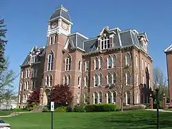 Located directly to the west of Hanna Hall, this structure was built between 1879 and 1899, and is a three-story, brick and sandstone building that was designed in the Second Empire style. It has a mansard roof and measures 158 feet long and 54 feet wide, with a cross-section that is 86 feet long and 50 feet wide. It was named for Alfred Brashear Miller, the president of Waynesburg College from 1859 to 1899. This building has housed administrative offices, classrooms, a laboratory, library, chapel, the Alumni Hall, and the "Martin Room."[2]