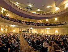 In 1987, the symphony association, stuck with a deteriorating building and a hefty debt, set a course for the restoration of the one-time burlesque house by undertaking its own fund-raising program and forgoing an offer to sell the building. A fund-raising effort resulted in the Allentown Symphony Association raising $10 million from public and private sources to improve the hall.[2] Restoration and renovation at Symphony Hall began in 1991 and in 2006, the renovation project repaired the exterior and roof, upgraded patron seating and lobby areas, created rehearsal, office and reception spaces, and added an entire wing with new lobby, teaching and dressing room spaces. In addition, the renovation project completed an upgrade of the Symphony Hall stage and constructed a new acoustical shell.[2] A second phase of renovations, funded as part of its $6 million 60th anniversary fundraising campaign held in 2011 replaced and reinforced the main stage floor and added doors between the inner lobby and the auditorium. Ongoing renovations will replace seating on the third-level balcony and improve and modernize the backstage area and lighting.[11]