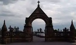 Within the cemetery there are three large sections of open space, each about the size of a football pitch, designated as "poor ground". Over 80,000 people are buried in the cemetery's poor grounds, many of whom died in the flu pandemic of 1919.[1] Since 2007, the 55-acre (220,000 m2) cemetery has undergone extensive work, reversing years of neglect.