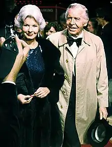 After twice marrying and divorcing showgirl Joyce Mathews, Berle married publicist Ruth Cosgrove (née Rosenthal) in 1953; she died of cancer in 1989.[28][66] In 1989, Berle stated that his mother was behind the breakup of his marriages to Mathews. He also said that she managed to damage his previous relationships: "My mother never resented me going out with a girl, but if I had more than three dates with one girl, Mama found some way to break it up."[67] He married a fourth time in 1992 to Lorna Adams, a fashion designer 30 years his junior. He had three children, Victoria (adopted by Berle and Mathews), William (adopted by Berle and Cosgrove) and a biological son, Bob Williams, with showgirl Junior Standish (née Jean Dunne Arthur; 1925–2006).[68] Berle had two stepdaughters from his marriage to Adams: Leslie and Susan Brown.[69] He also had three grandchildren: Victoria's sons James and Mathew,[66] and William's son Tyler Daniel Roe, who died in 2014.[70]
