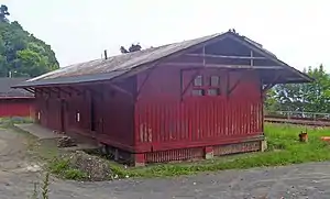 The building is a one-story frame 30-by-83-foot (9.1 by 25.3 m) rectangular building with a broad gable tin roof and overhanging eaves. Its board-and-batten siding is painted red. The northern two-thirds of the building, the oldest part, sits on a sandstone foundation, while the southern portion rests on masonry piers.[1]