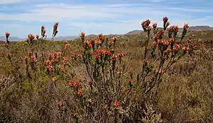 Mimetes capitulatus is an evergreen, upright, rounded shrub of about 2 m (7 ft) high, from the family Proteaceae. It has greyish green, lance- to egg-shaped leaves ending in a thickened tip. The flower heads and subtending leaves form a cylindric inflorescence, topped by ordinary, more or less upright leaves. Each primarily orange flowerhead contains 10–13 flowers with conspicuously scarlet styles, yellow under the narrow hourglass-like pollen presenter at its tip. Flowers can usually be found from mid-June till December, peaking in August. It is called conical pagoda in English and skraalstompie in Afrikaans.[2][3]